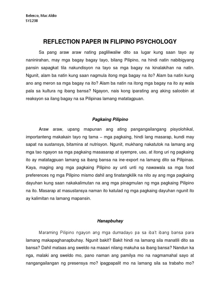 Reflection Paper In Tagalog : The Indolence Of The Filipino People Reaction Paper Free Essay Example / In this article, we are going to take a look at the word reflection and its translations into tagalog based on context.. While writing a reflection paper, you should stop, think and reflect about yourself. A reflection paper refers to one where the student expresses their thoughts and sentiments about specific issues. A reflection paper is meant to illustrate your understanding of the material and how it affects your ideas and possible practice in future. A reflection paper format is a structural description or outline of the various points that will be discussed in the essay, according to the. I'm sure that you already have enough.